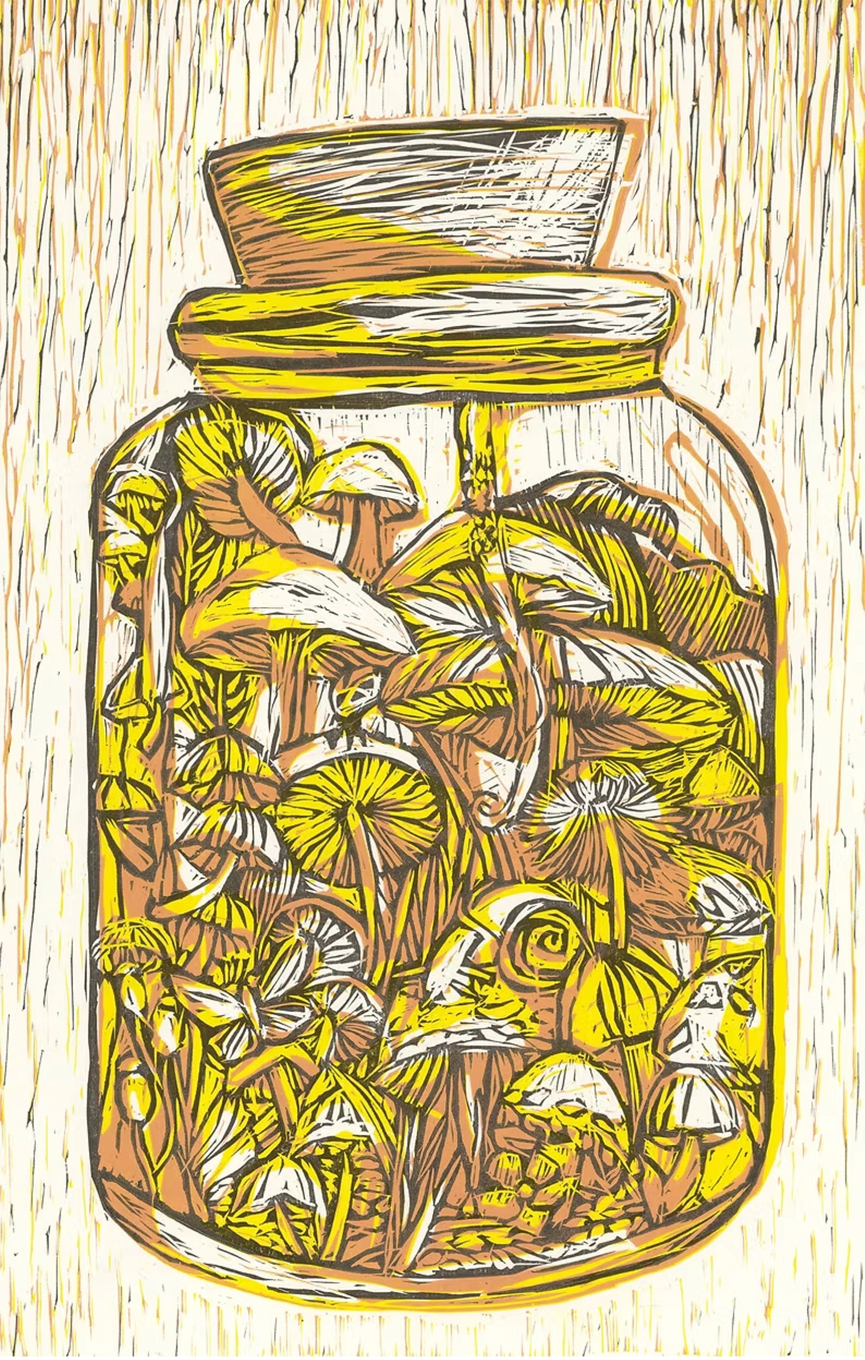These studies later evolved into linoprints that reimagine nature through layers of pattern and color, where memory replaces reality and structure becomes narrative.