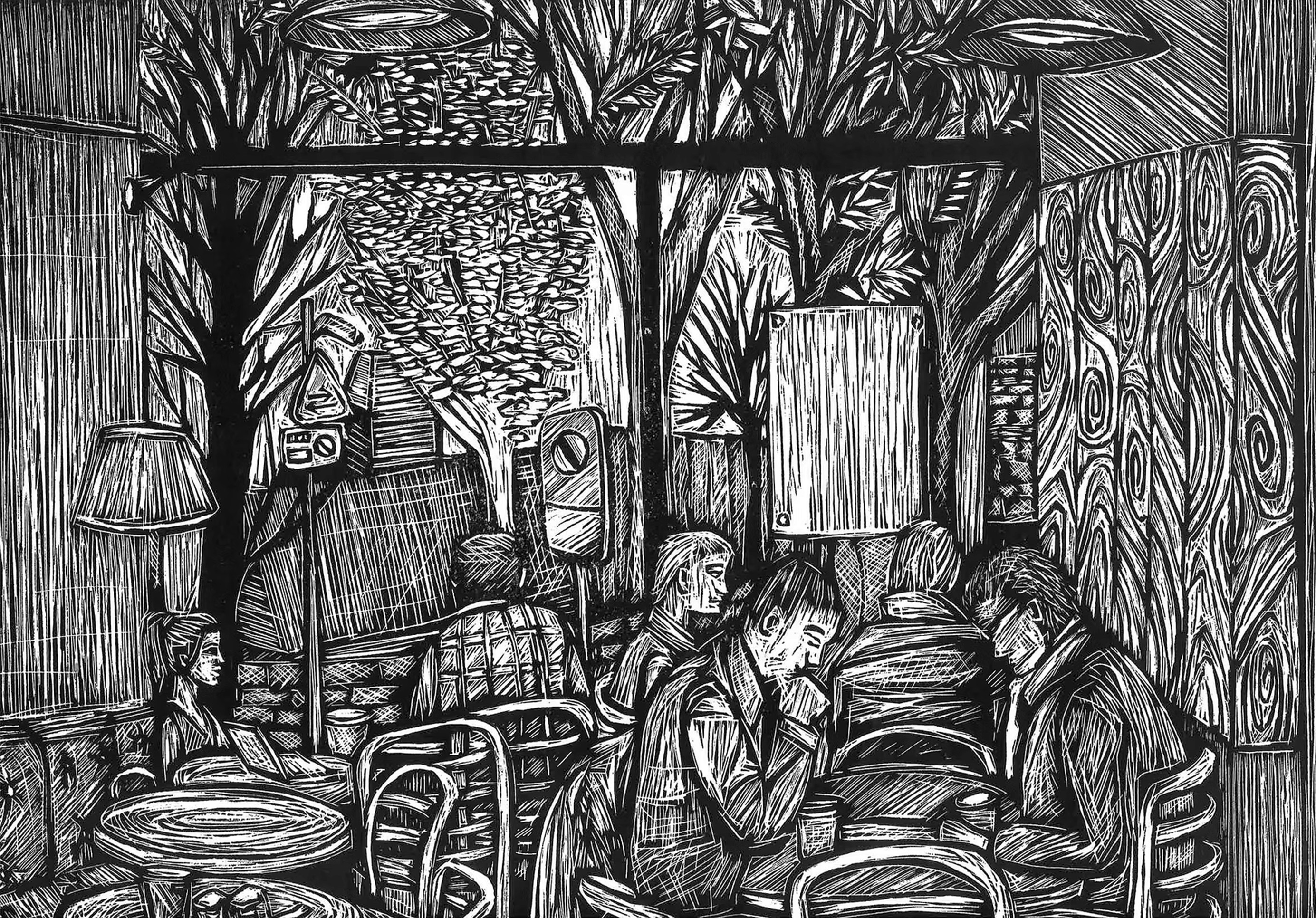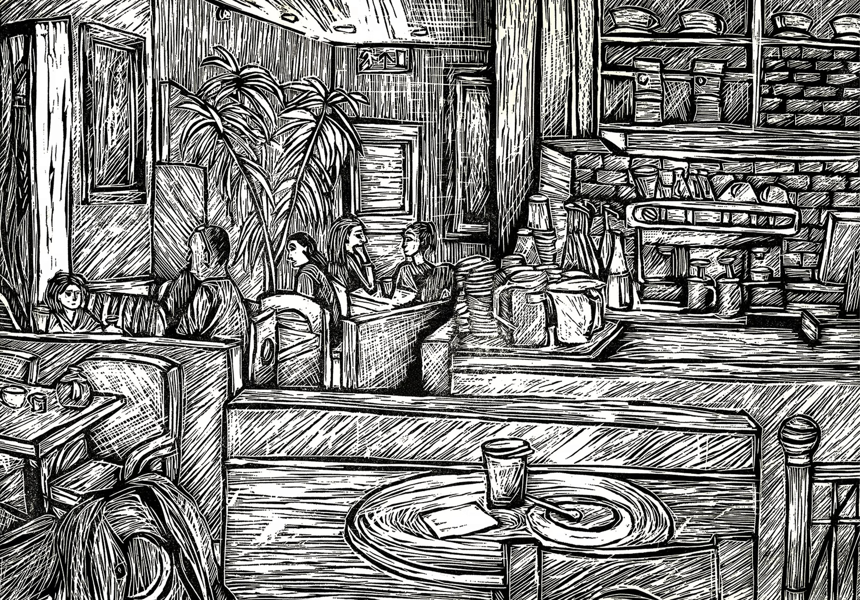 A reflection on structure, repetition, and the quiet rhythm of daily work life, where motion becomes routine These prints capture quiet moments in everyday environments, cafés, workplaces, and shared spaces where people coexist but remain within their own thoughts. Through repetition of line and rhythm, the series reflects the subtle patterns of human presence, routine, and solitude within connection.