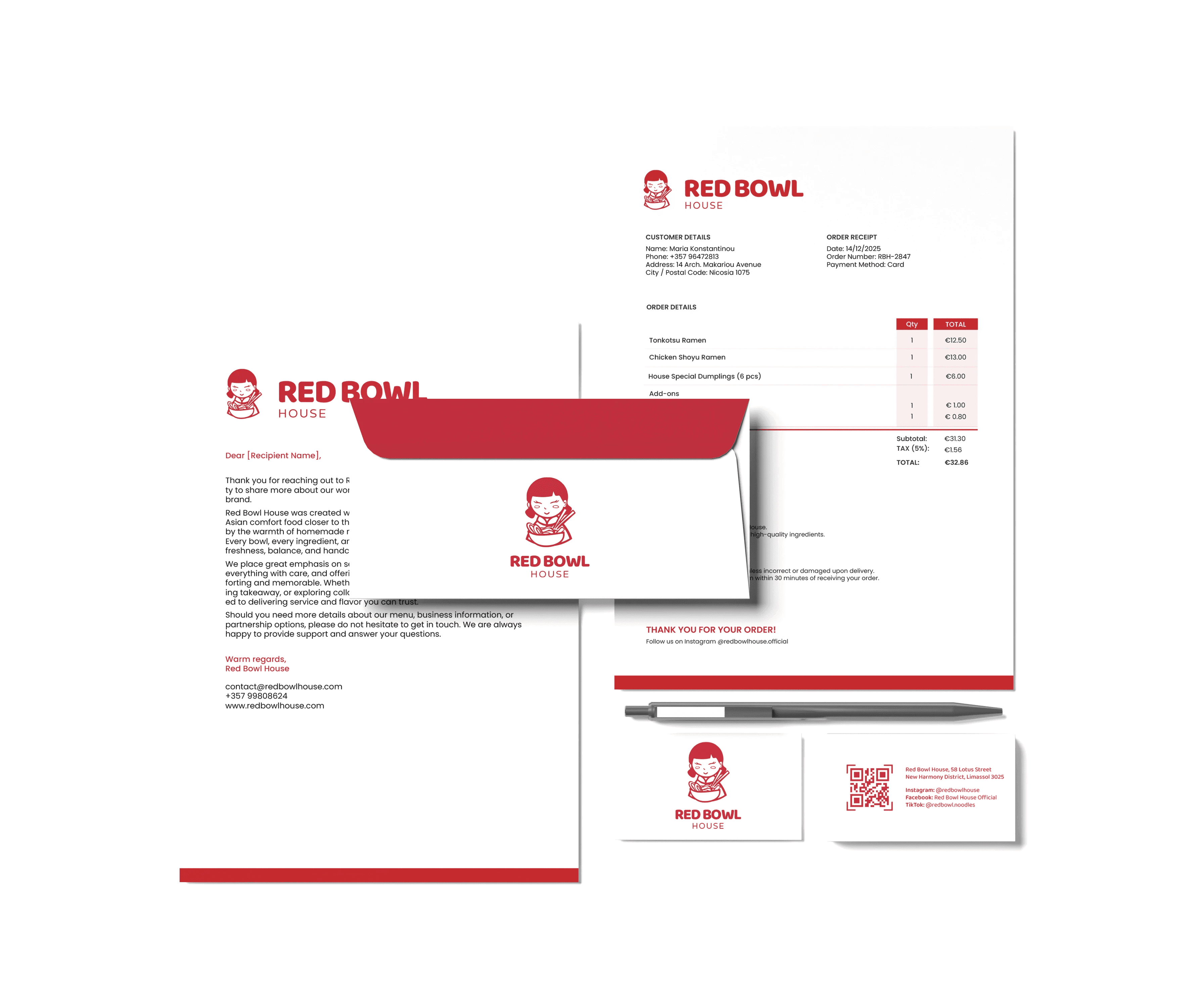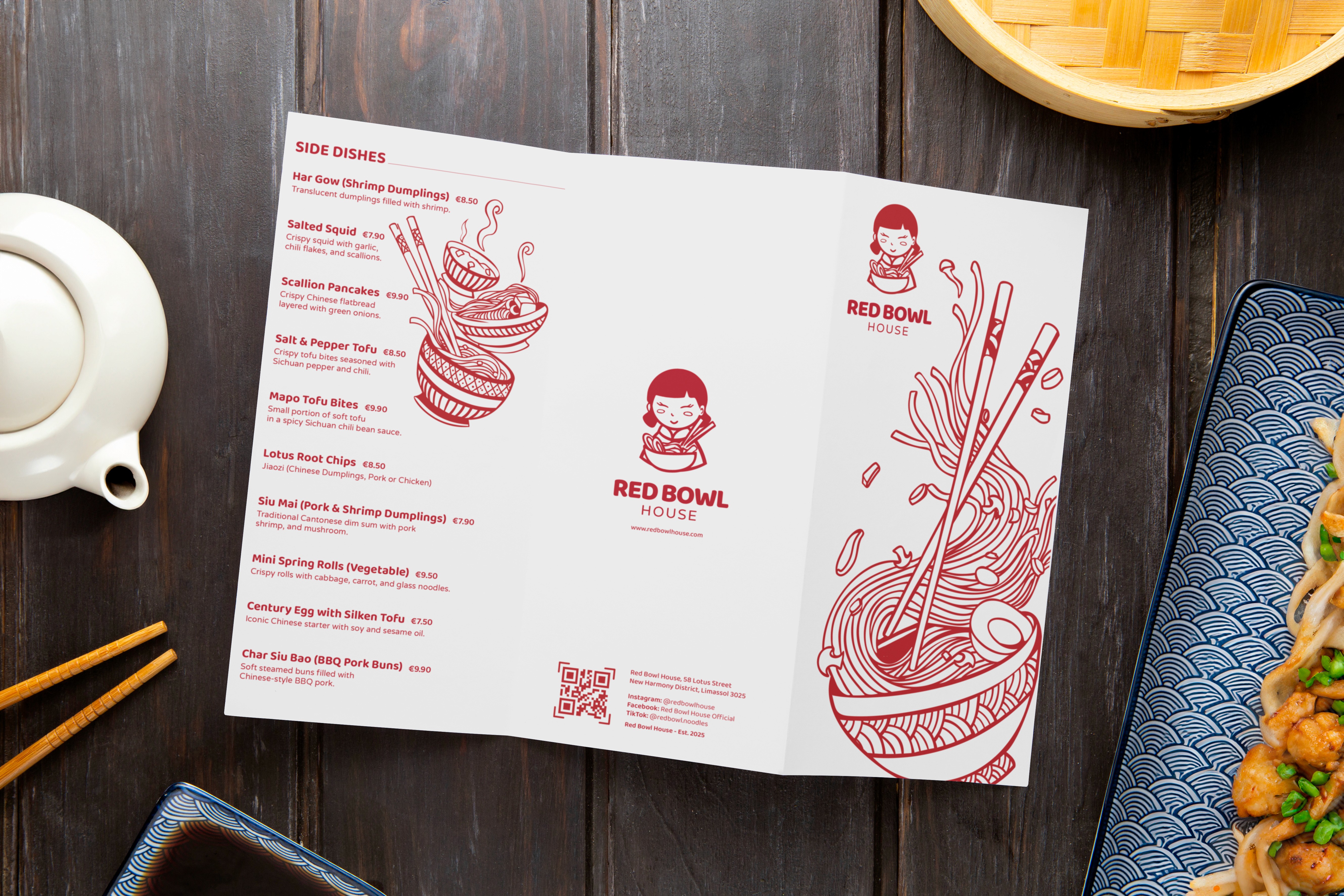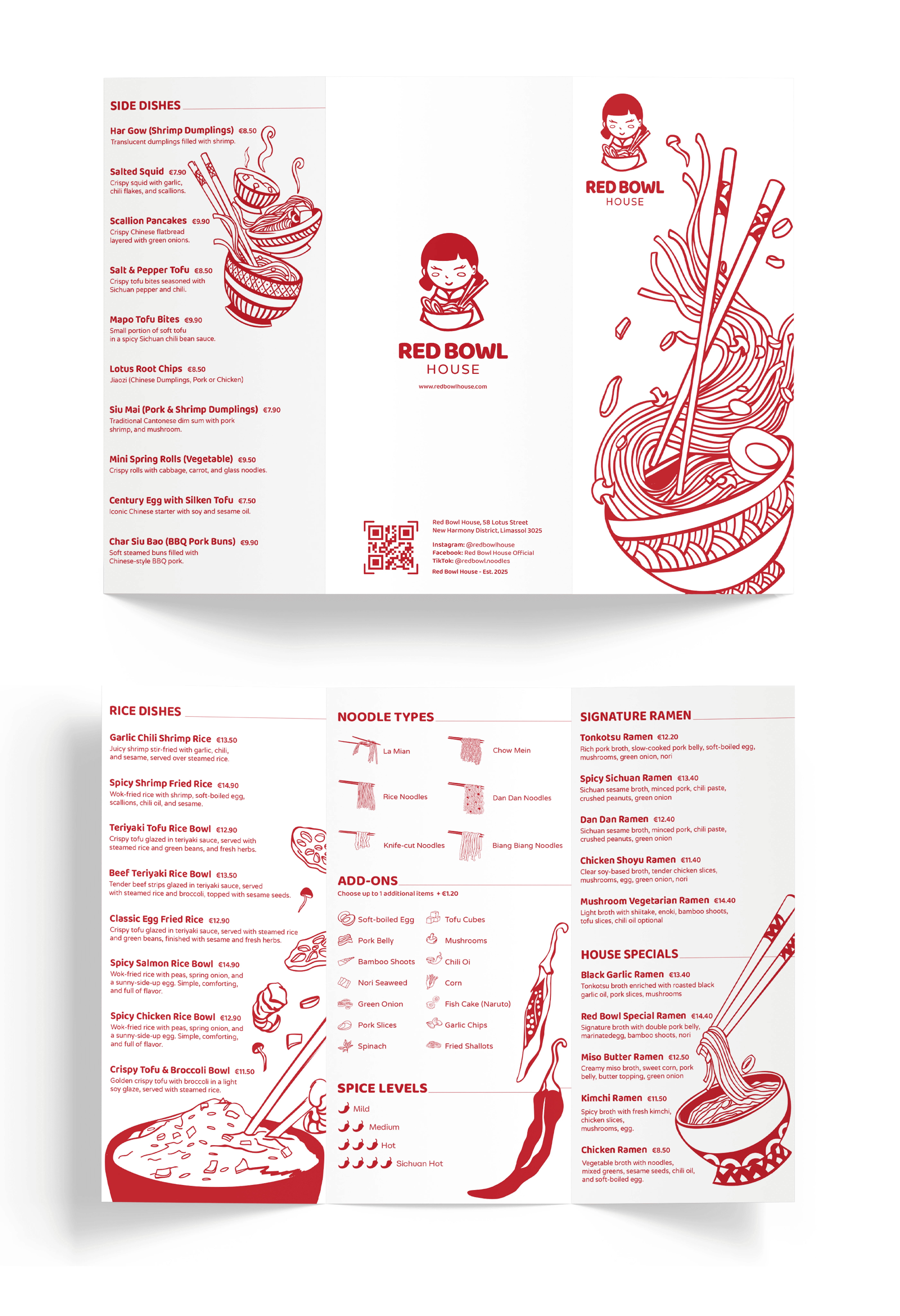 Red Bowl House is a conceptual Asian inspired comfort food brand focused on noodles, dumplings, and take away meals. The goal was to create a distinctive and friendly brand identity that feels warm, approachable, and recognisable, while standing out in a competitive food and takeaway environment.