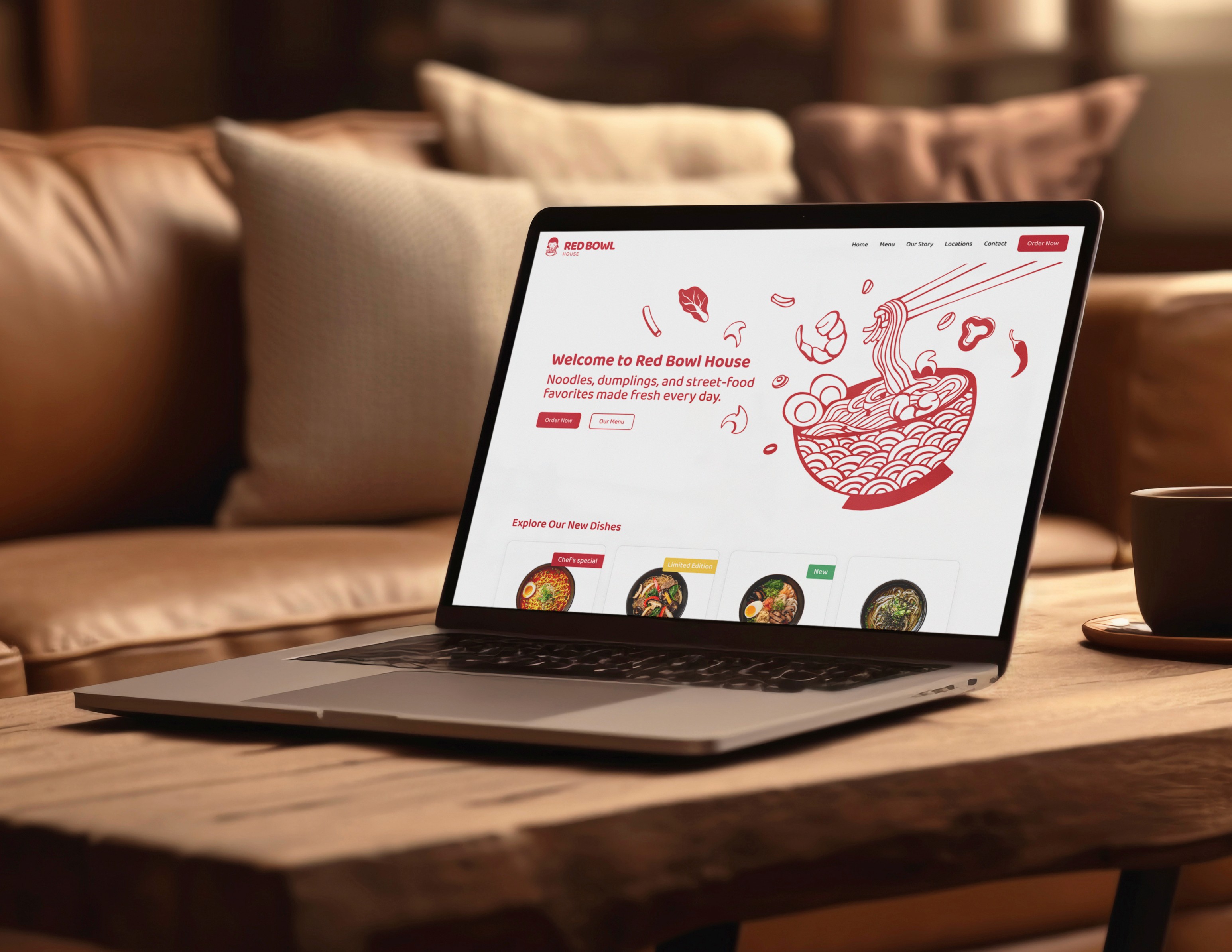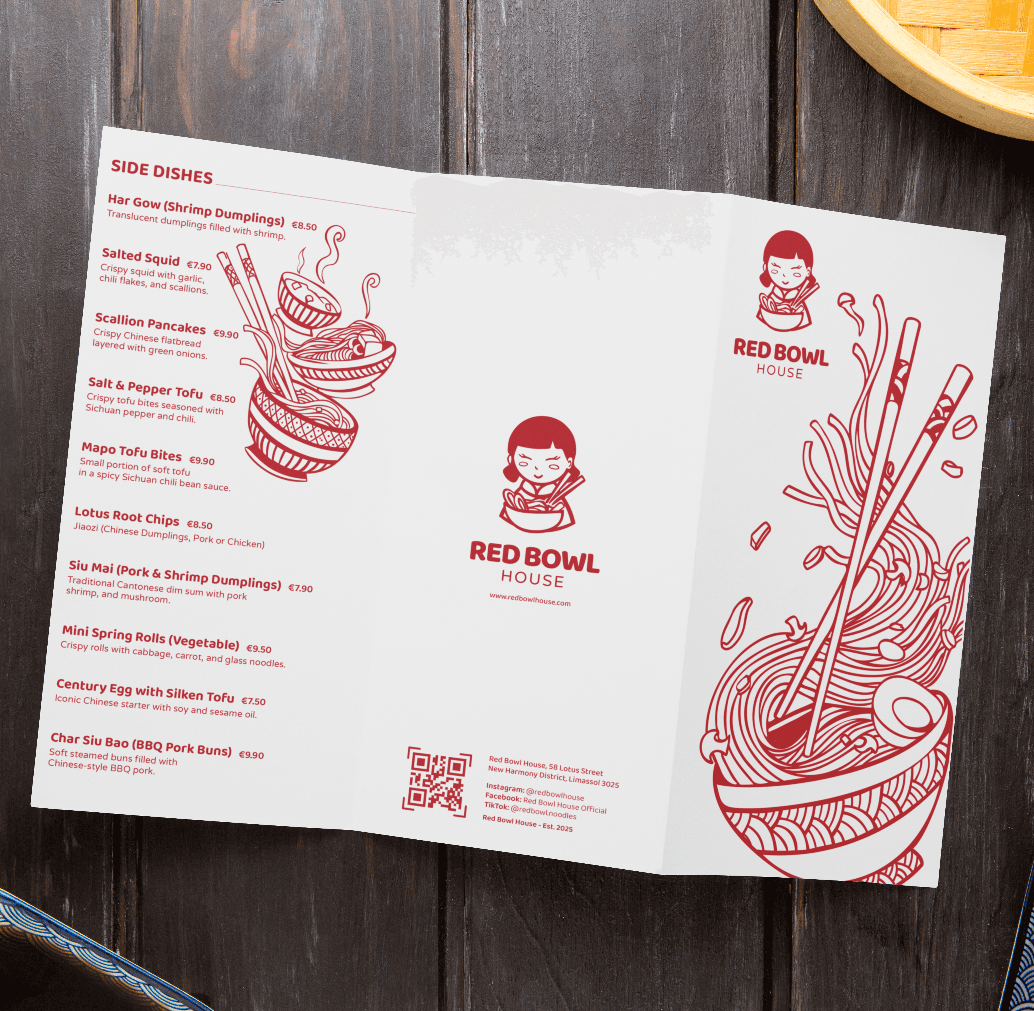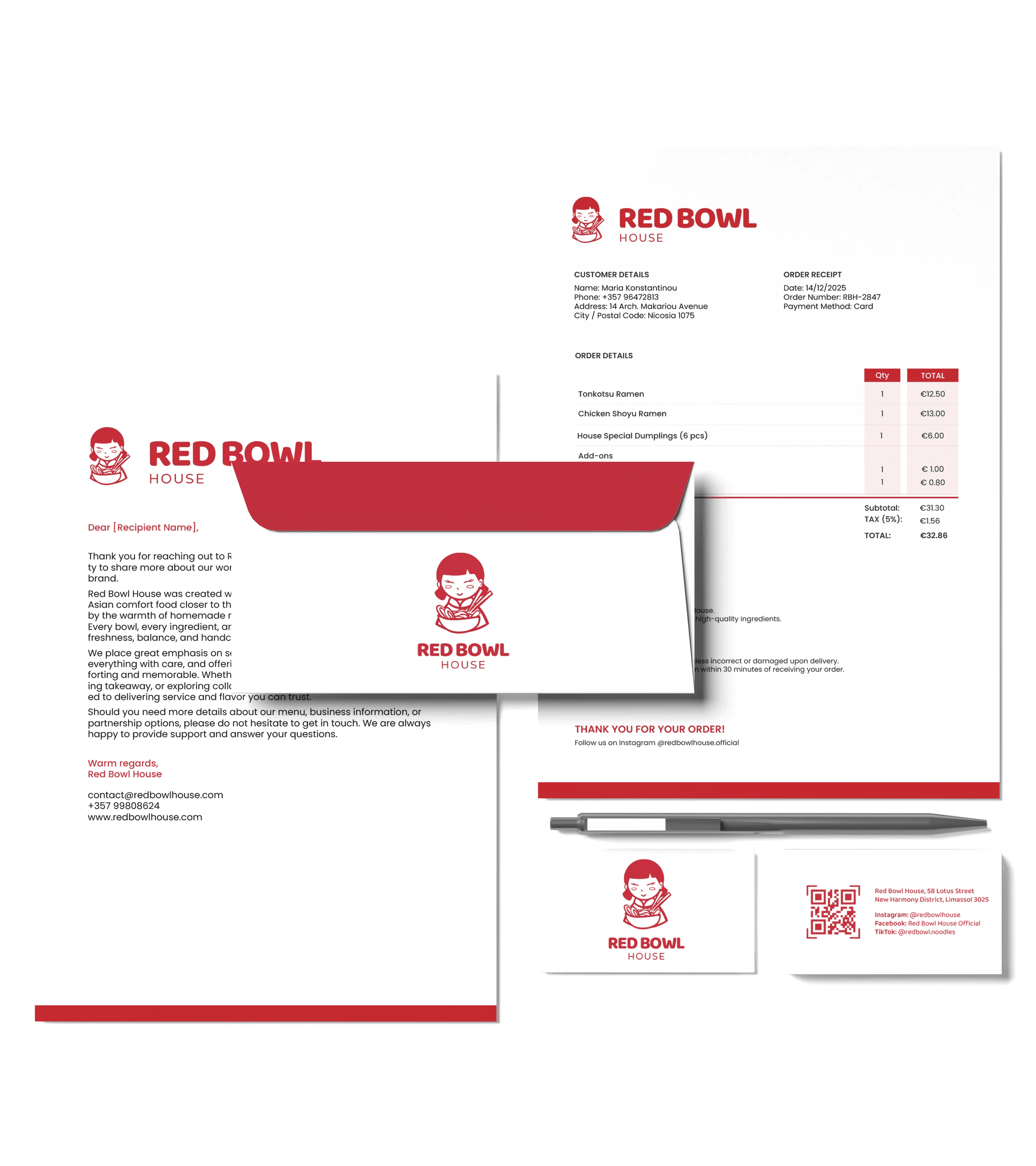 Red Bowl House is a conceptual Asian inspired comfort food brand focused on noodles, dumplings, and take away meals. The goal was to create a distinctive and friendly brand identity that feels warm, approachable, and recognisable, while standing out in a competitive food and takeaway environment.