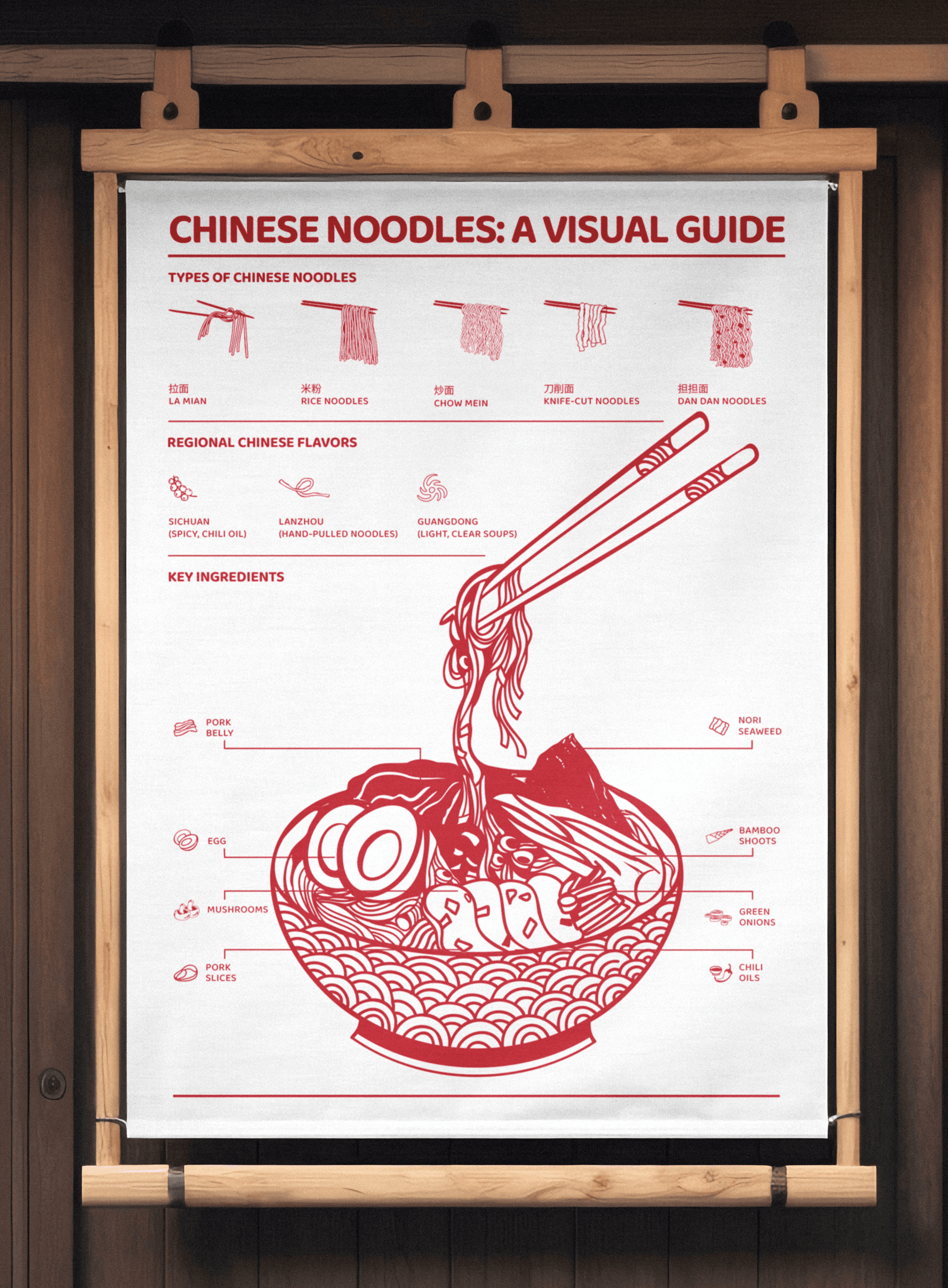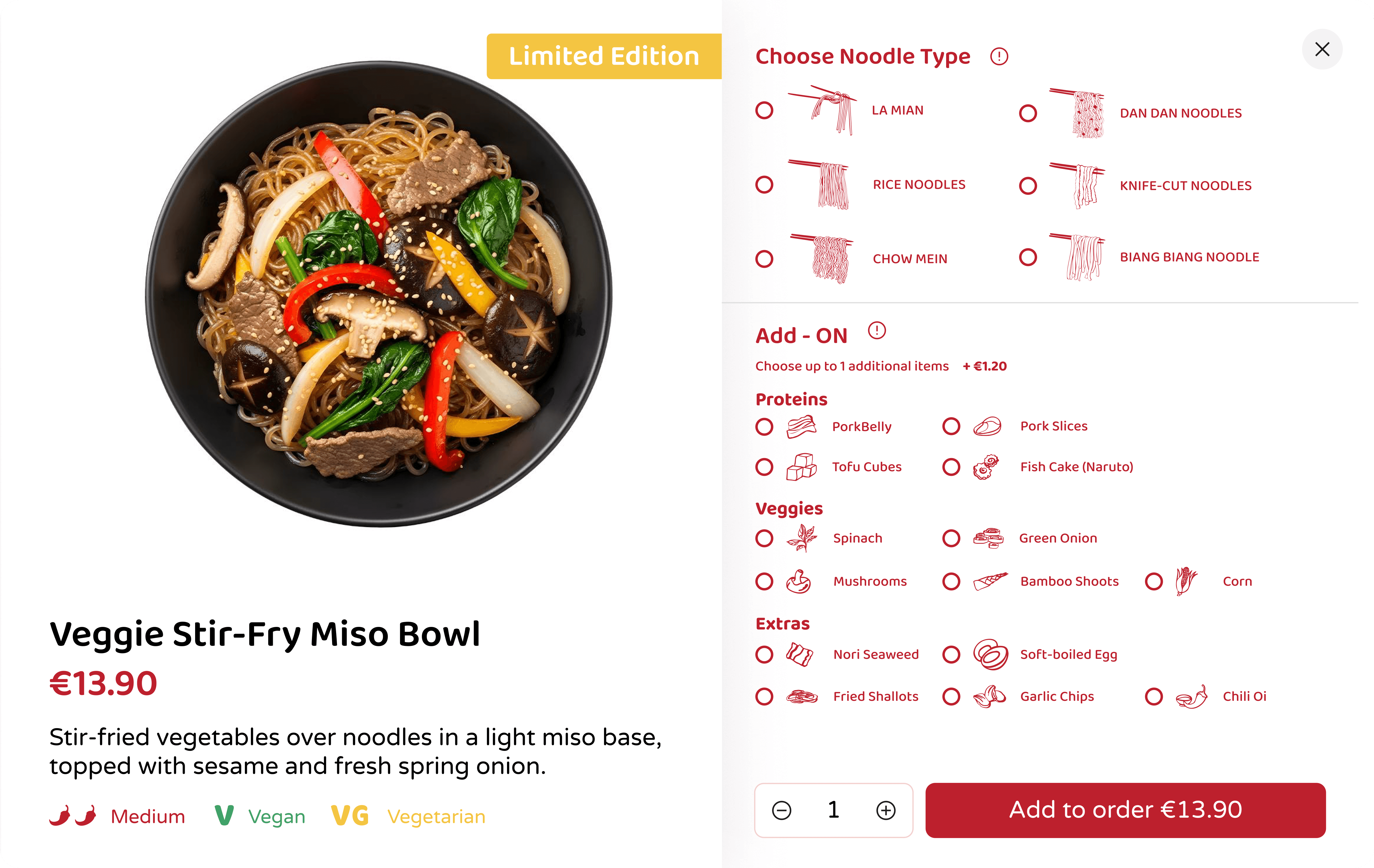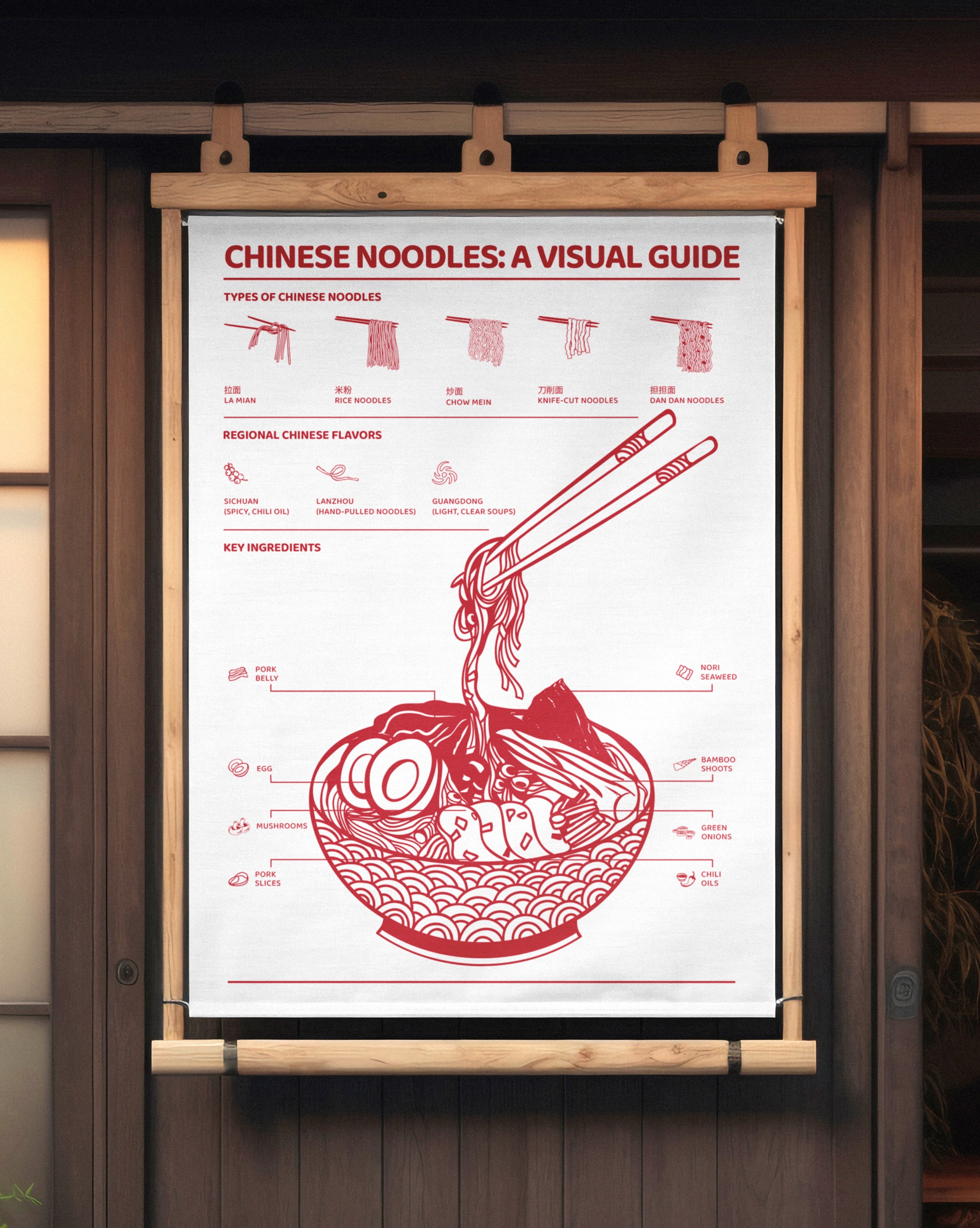 The concept combines playful illustration with a clean, modern visual system inspired by Asian street food culture and the comfort of homemade meals. A small illustrated character enjoying a bowl of noodles became the core brand element, expressing friendliness, warmth, and authenticity. A supporting system of mono line illustrations and warm red tones was developed for packaging, stationery, and digital applications, creating a cohesive and memorable visual identity.