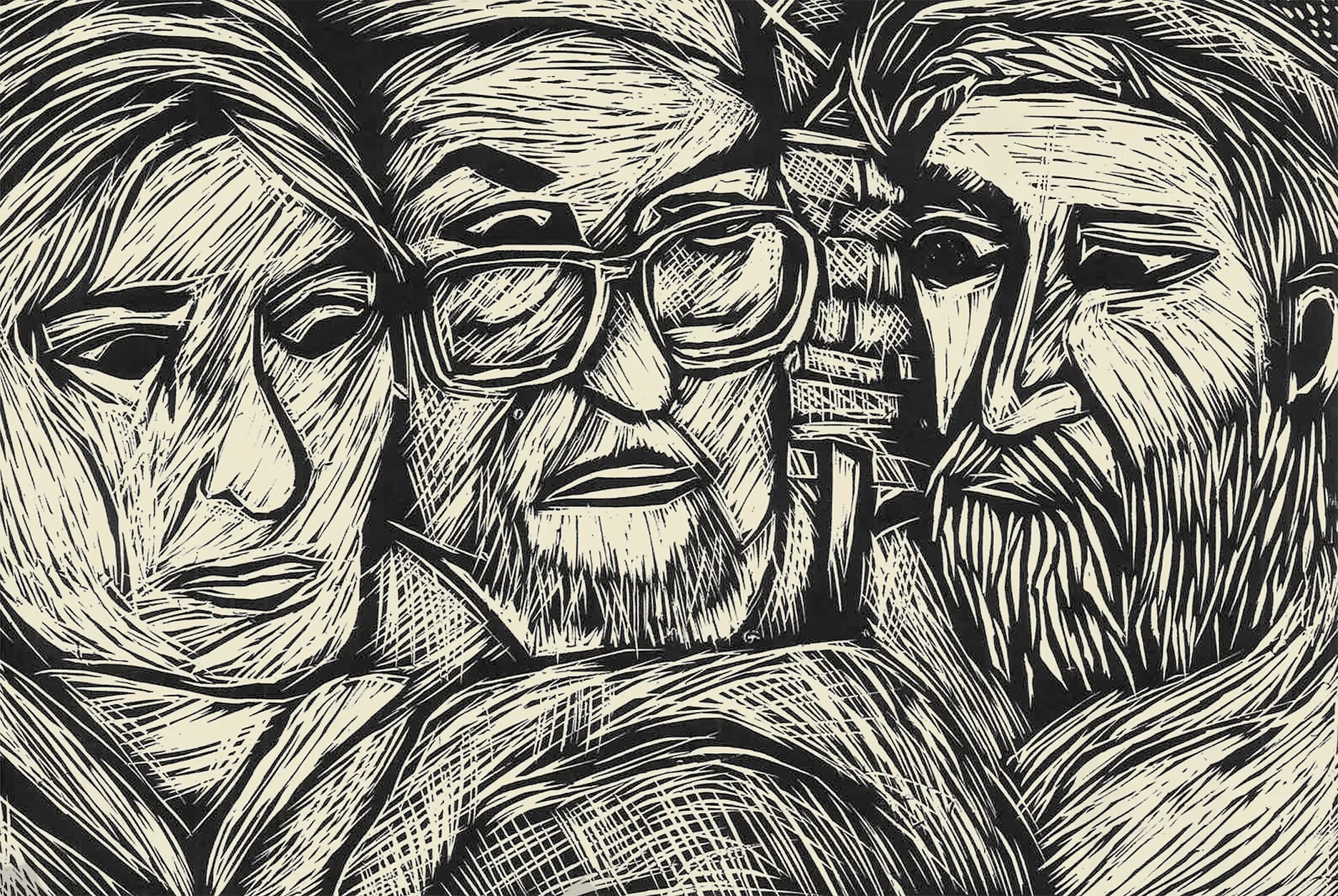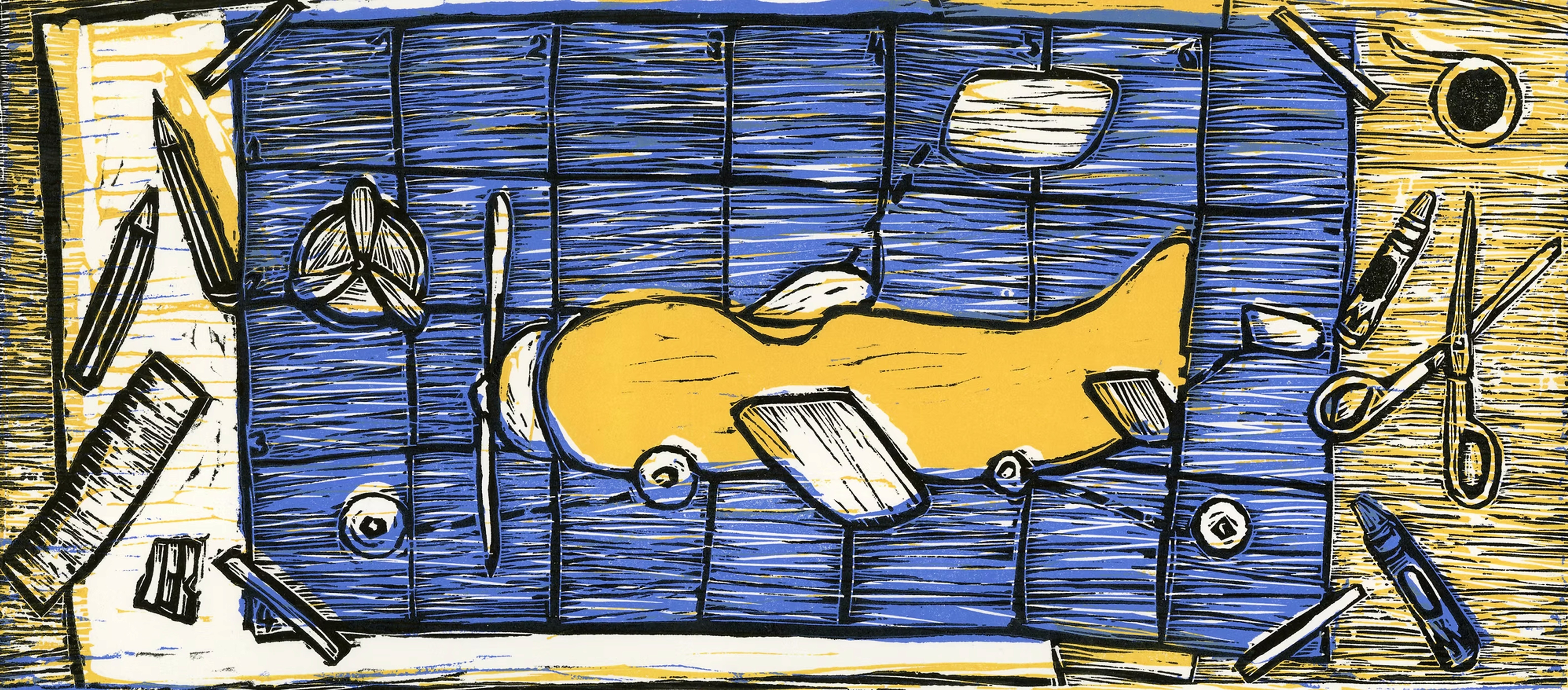 These linoprints were inspired by children’s stories, one about a young boy who dreams of building his own airplane, and another based on The Boy Who Cried Wolf.